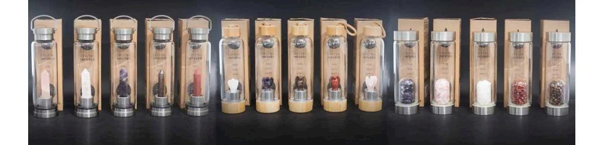 Take advantage of the properties attributed to natural stones thanks to the new Crystal Infused Glass Bottles. Inside we put gemstone obelisks, angels or chips. Choose from cleansing clear quartz, relaxing amethyst, rejuvenating rose quartz, invigorating red jasper or determined tiger's eye. In most models, the stones are exposed directly to the surrounding water.