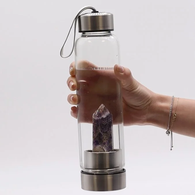 Embrace the qualities of crystals in your daily routine, you can energise and purify your body with these high frequency crystal water bottles. Take advantage of the claimed health benefits of crystals with these glass water bottles. These bottles feature a crystals point on a screw-off stainless steel base, for easy cleaning, and a rubberised anti-slip bottom. The gemstone is directly exposed to the water around it and can be easily removed for handwashing.