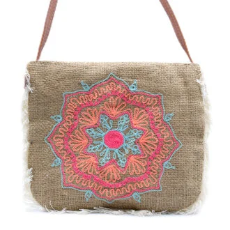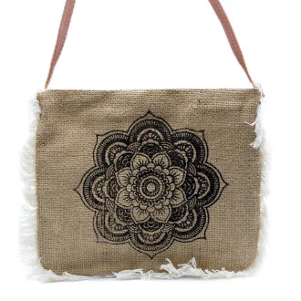 Finished with a quality (PVC) leather effect strap (112 cm), brushed cotton fringe and cotton inside lining. Ethically traded and made in Bali by a family business.