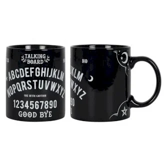 This quality ceramic mug features a classic talking board/ouija board design in white on a black base. The letters of the alphabet are positioned in a semi circle design with the words YES and NO at the top and numbers plus GOODBYE at the bottom.