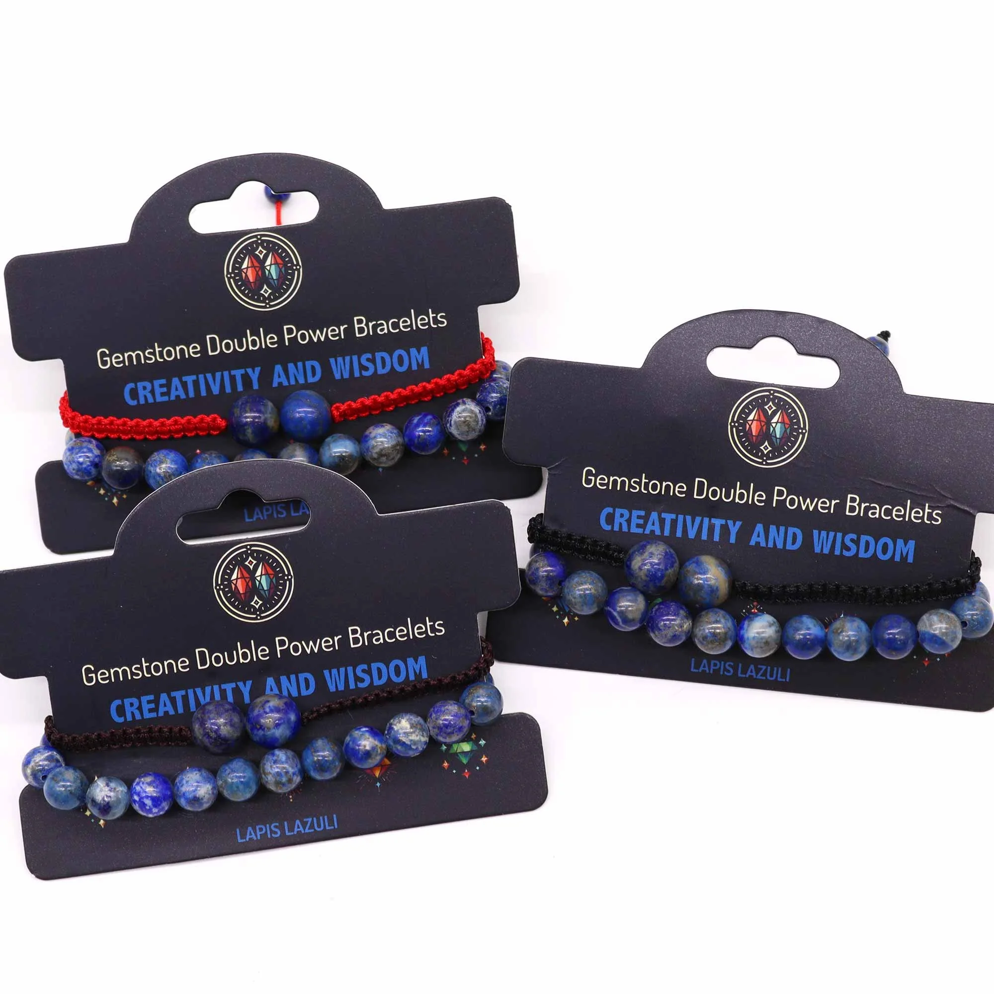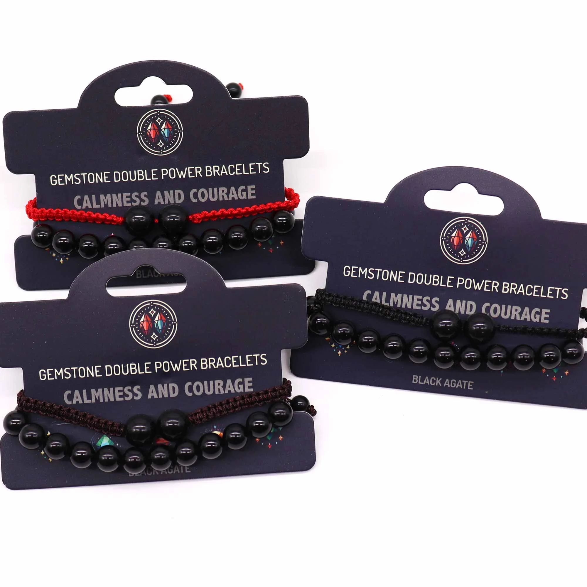 Each bracelet set comes with a header card clearly stating the benefits of the gemstone, such as "Strength and Confidence, "Calmness and Courage" or "Love and Harmony" etc. The header card messaging helps convey the purpose of each bracelet at a glance.