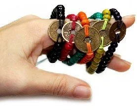 Good Luck Feng Shui Bracelets are made from wooden beads and coins of fortune.