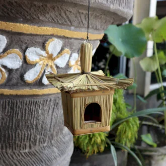 Designed in Bali, this range of birdhouses is crafted from seagrass, making a fantastic gift for a keen gardener or just to entertain the family, while creating a home to neighbourhood birds. Some are decorated with bamboo wind chimes, creating a rustic garden ornament, sure to bring a fairytale cottage inspired look to any outdoor space. A lovely garden accessory to attract plenty of feathered friends, the front features an extra wide entrance hole β perfect to accommodate a variety of birds. Featuring a hanging rope so it can be easily hung from a tree branch or bracket.